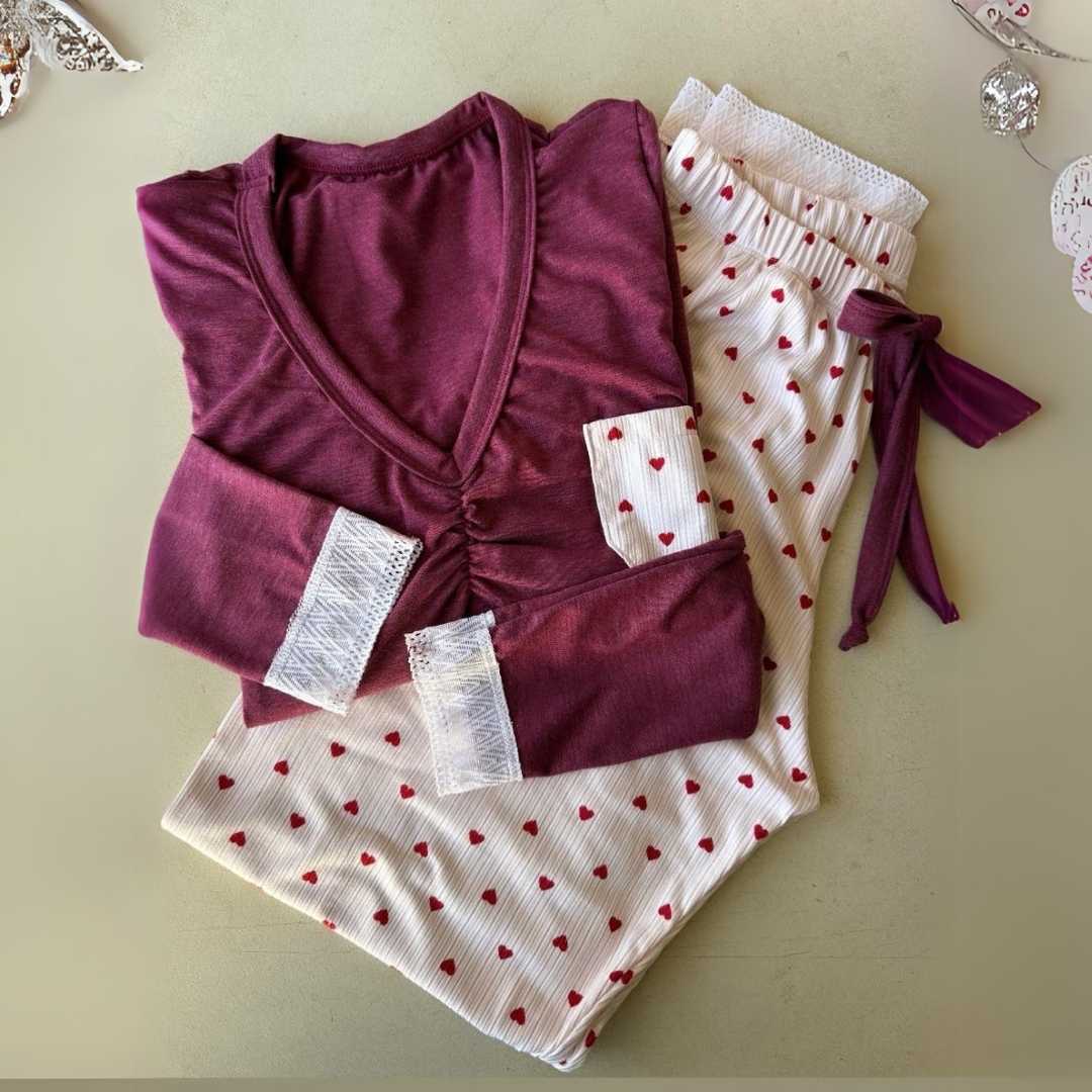 Pijama compuesto por remera de algodón con spandex tono bordó con frunce en escote y puntilla blanca en mangas. Pantalón con estampado de corazones en morley elastizado, con detalle de puntilla y piolitas.